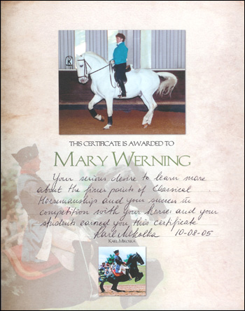 Mary has been a student of the classical method of training for …. “Karl Mikolka and his vast knowledge have helped me with all my horses— from three-year-olds to horses in their 20s. I started riding with Karl in 1988 and all I can say is that he still continues to amaze me. He has helped me with mares, geldings, and stallions but Karl’s understanding of the stallion mind is/was invaluable to me.”